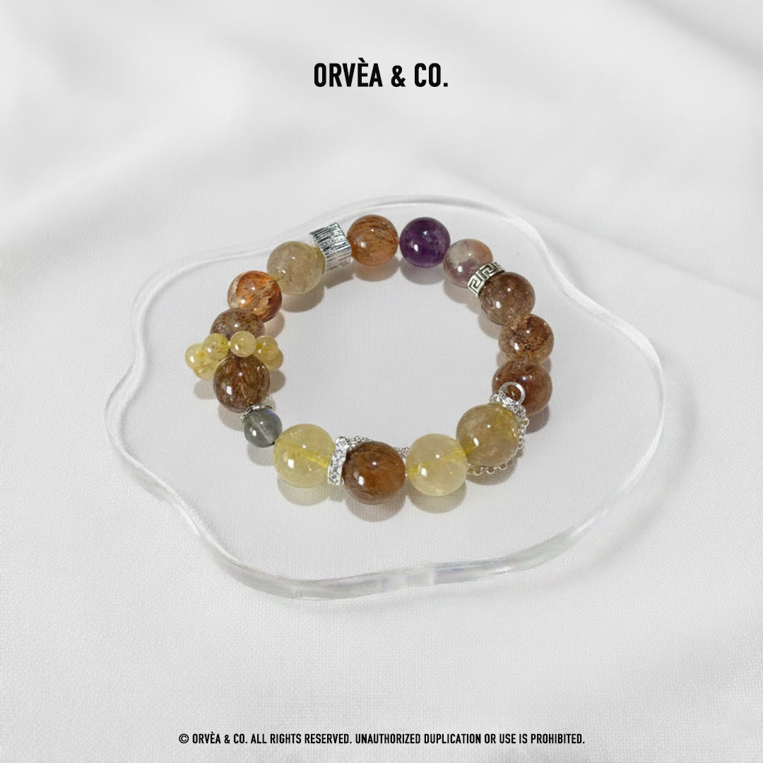 Custom Crystal Bracelet - with Amethyst Phantom Quartz, Golden Rutilated Quartz, Grey Moonstone & Black-Gold Super Seven Quartz - [Standard]
